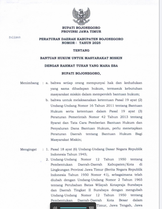 Peraturan Daerah Kabupaten Bojonegoro Nomor 4 Tahun 2025 tentang Bantuan Hukum untuk Masyarakat Miskin merupakan landasan hukum daerah yang mengatur penyelenggaraan bantuan hukum secara gratis, terukur, dan berkeadilan bagi warga yang tidak mampu. Peraturan ini hadir sebagai wujud komitmen Pemerintah Kabupaten Bojonegoro dalam menjamin terpenuhinya hak konstitusional setiap warga negara, khususnya masyarakat miskin, untuk memperoleh akses terhadap keadilan dan kepastian hukum.