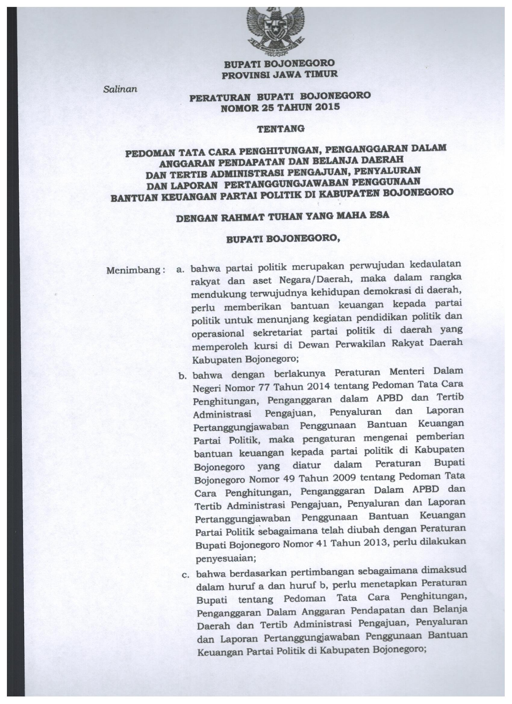 Bahwa dalam rangka menindaklanjuti ketentuan Pasal 9 Peraturan Daerah Kab. Bojonegoro Nomor 10 Tahun 2015, perlu menetapkan Peraturan Bupati tentang Penjabaran Pertanggungjawaban...
